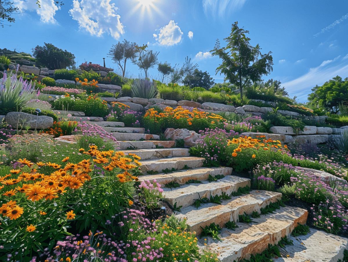 Utilisez des matériaux adaptés pour un aménagement pérenne. Le bois traité en autoclave, protégé par des produits de préservation, offre une solution durable pour les escaliers ou les soutènements. La rocaille, les pas japonais, le dallage ou encore les escaliers en pierres ou en bois ne sont pas seulement fonctionnels, ils apportent une dimension esthétique indéniable. Une chute d’eau pourrait même être envisagée pour ajouter un élément dynamique et sonore à votre jardin en pente.